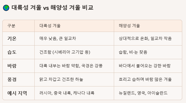 - 바다는 열을 저장하는 성질이 강해 여름에는 덜 덥고 겨울에는 덜 춥지만, 겨울철 대기와의 온도 차이 때문에 체감은 매우 차갑다.