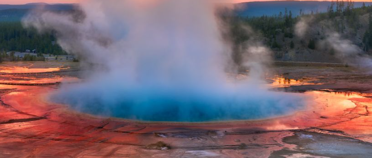 Grand Prismatic Spring at sunrise, Yellowstone National Park, Wyoming, USA